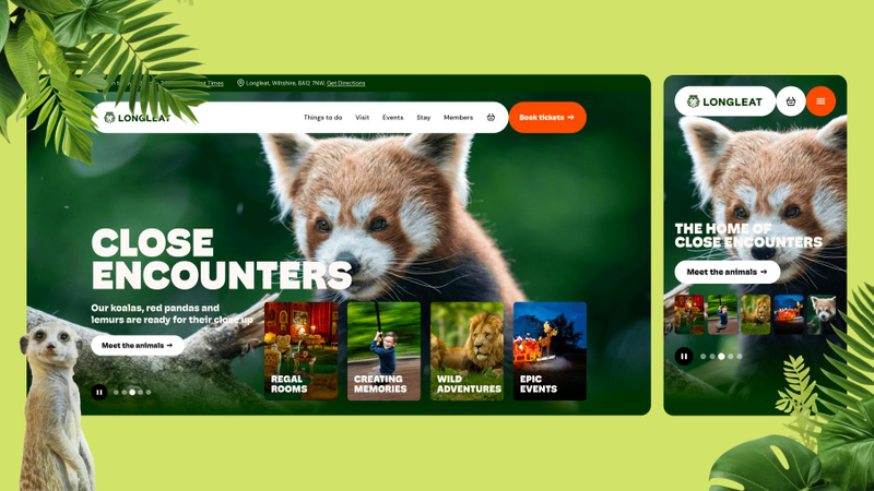 Scroll, and animated animals of some of Longleat’s cheekiest residents pop up – meerkats peeking through foliage, lemurs hanging from branches – lightly guiding users deeper into the site. There aren’t throwaway flourishes; they anchor navigation, soften key decisions and keep the experience feeling alive right through to checkout.